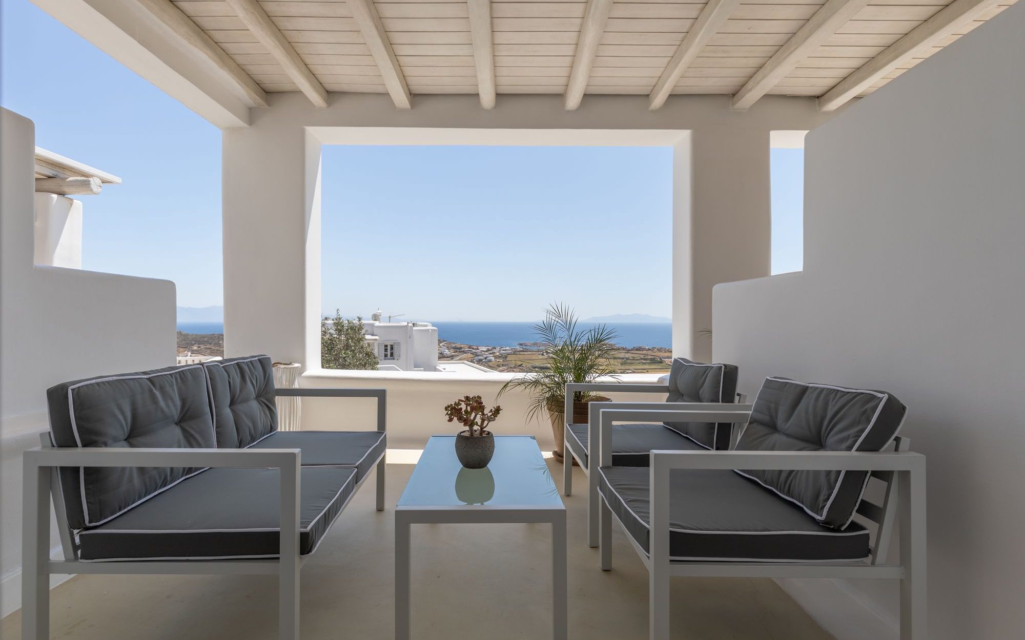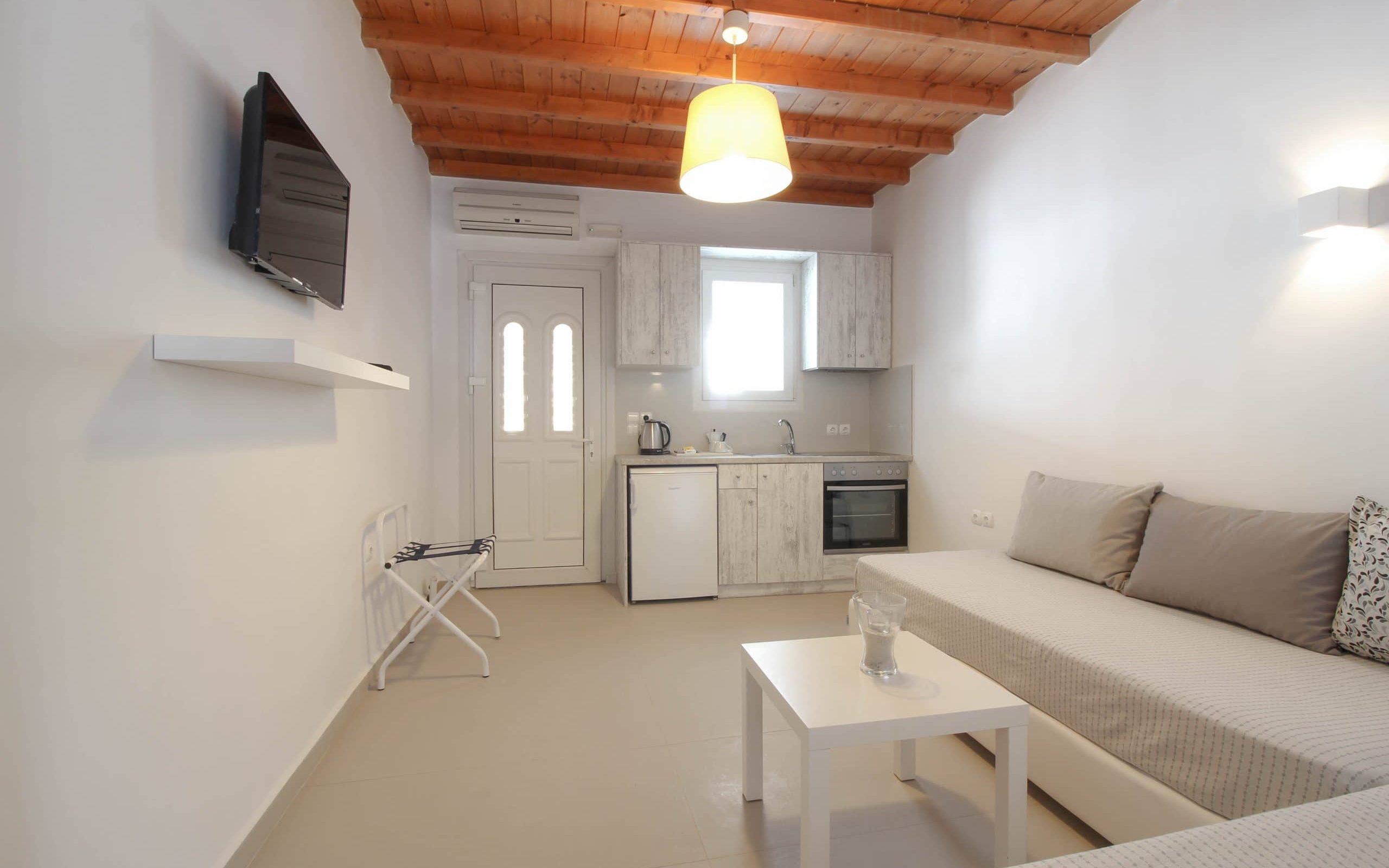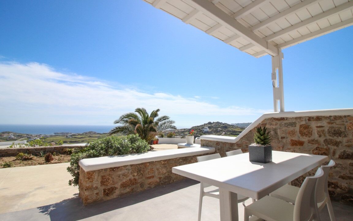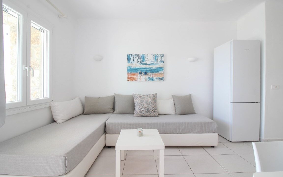With Mykonian and Cycladic design touches in every corner, the One Bedroom Apartment welcomes guests to its comfortable interiors. The apartment includes a bedroom with access to the private terrace with breathtaking sea views, a fully equipped kitchen, and a living room with two sofas that convert into beds, making it an ideal choice for families or groups of 2–4 people.