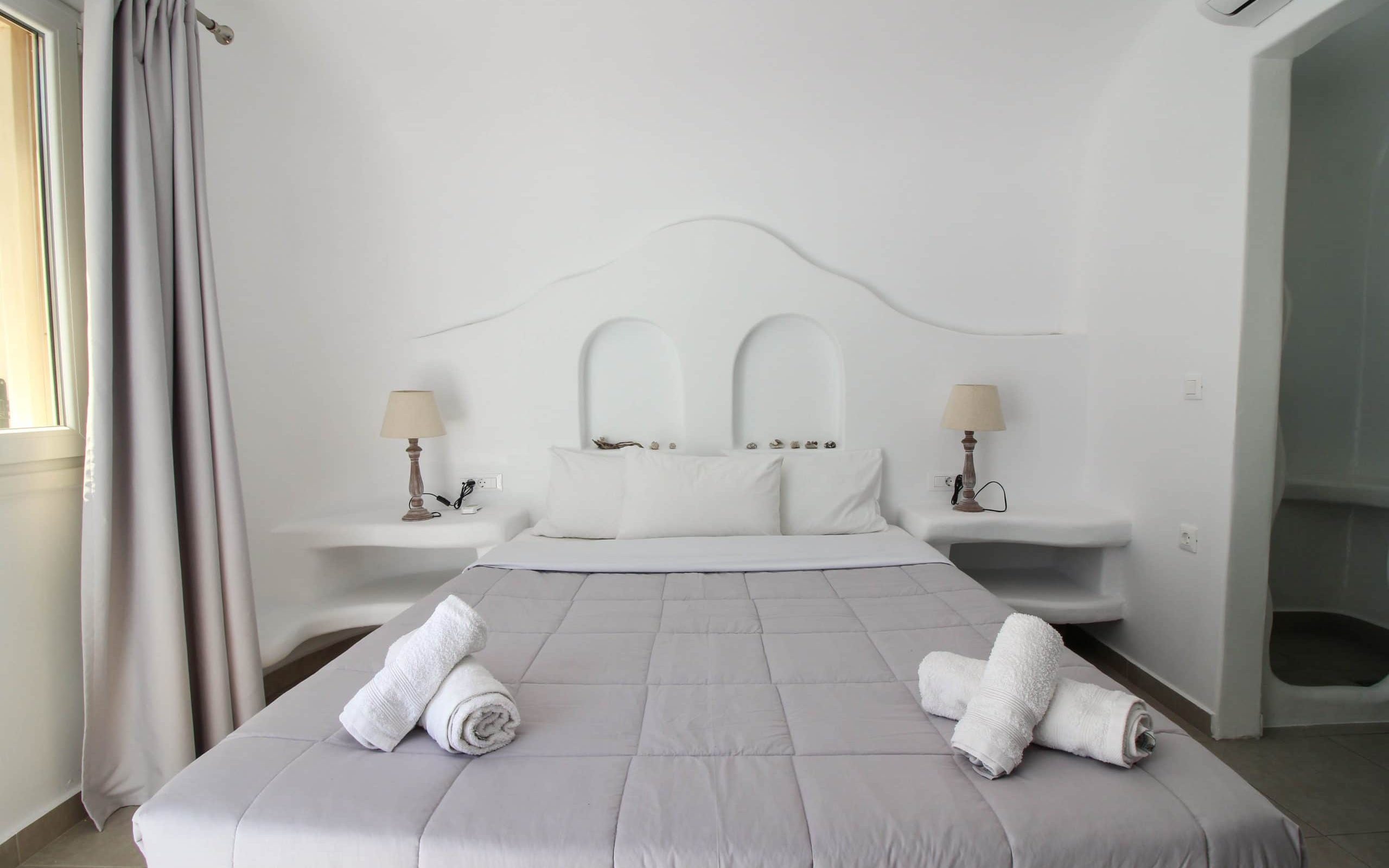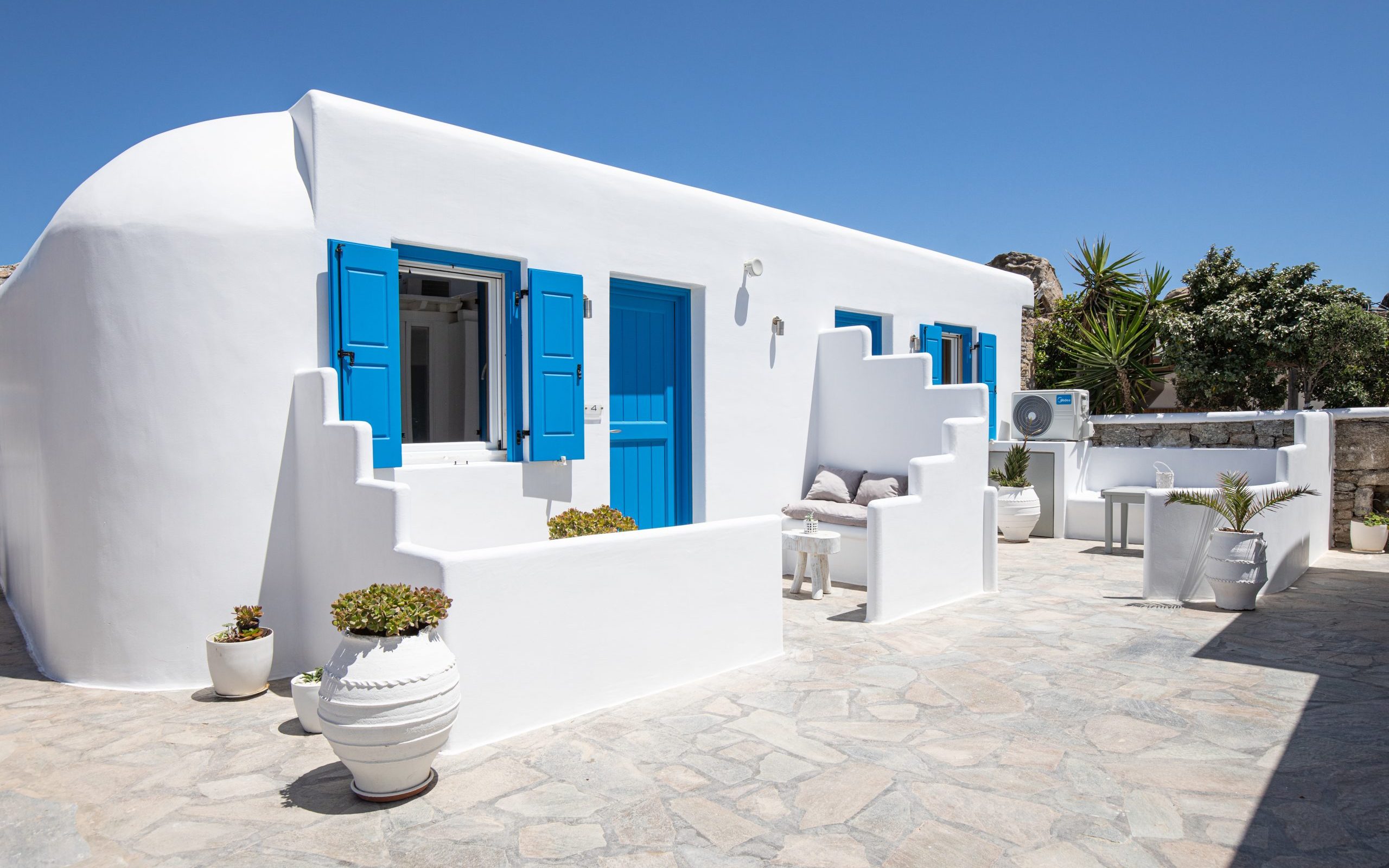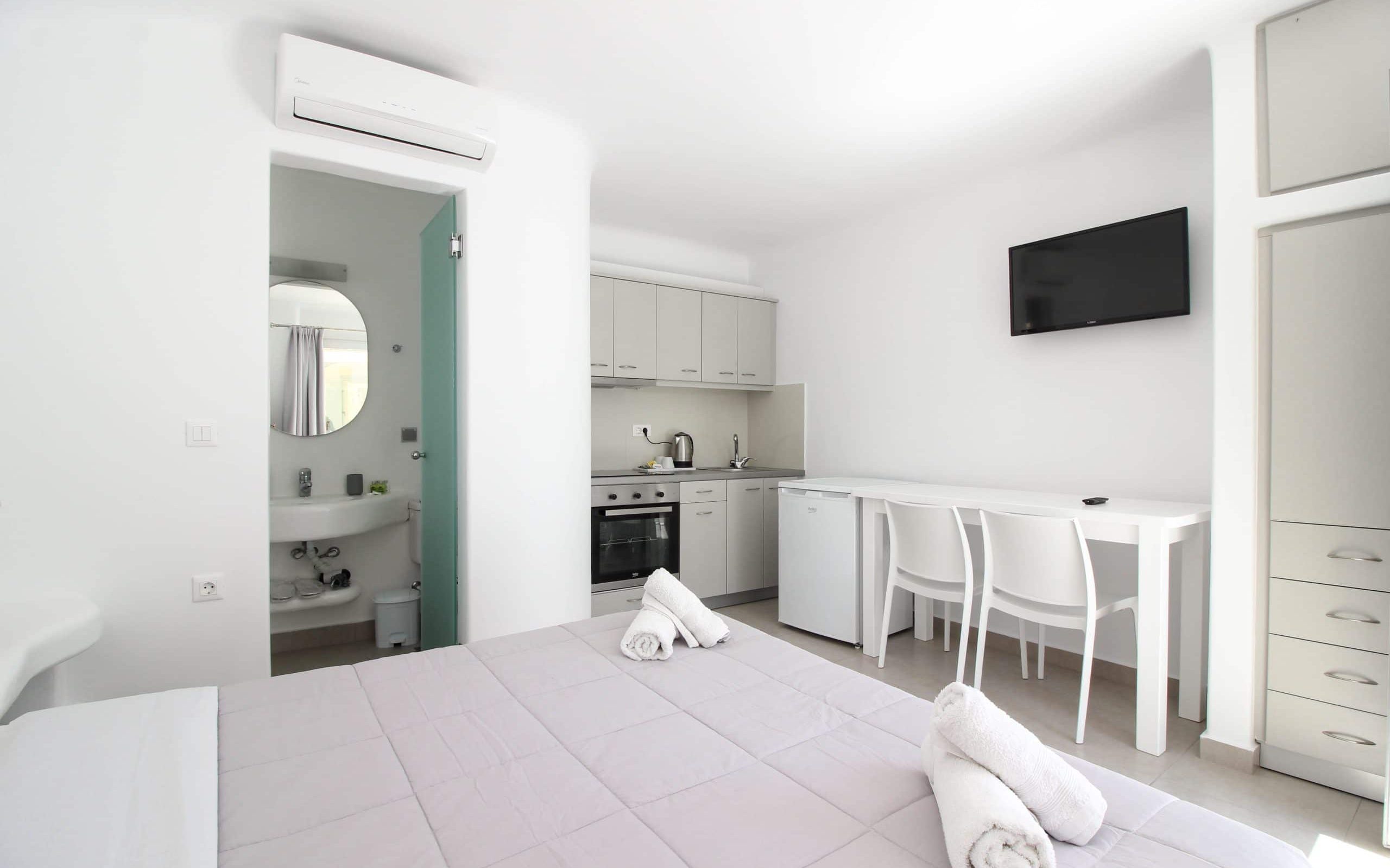 Predominant Cycladic design elements, like the striking white walls and the traditional built in bed, highlight the grandeur of simplicity and predict a truly unimaginable stay in a comfortable environment. The studio has a fully equipped kitchen and offers direct access to the complex’s courtyard. Ideal for couples.